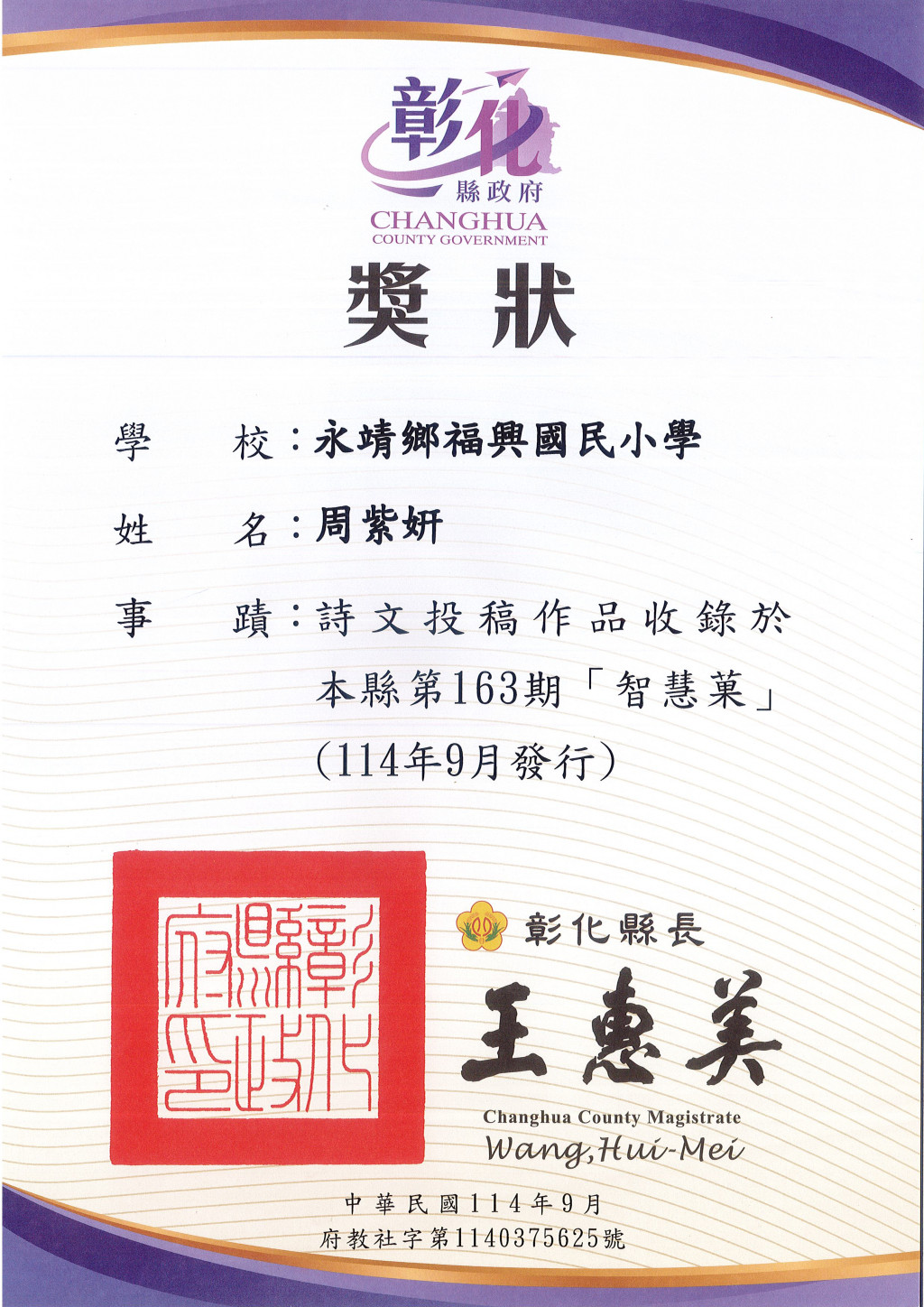 賀!四甲周紫妍作品〈家鄉快樂遊〉收錄於本縣第163期《智慧果》(114年9月發行)。