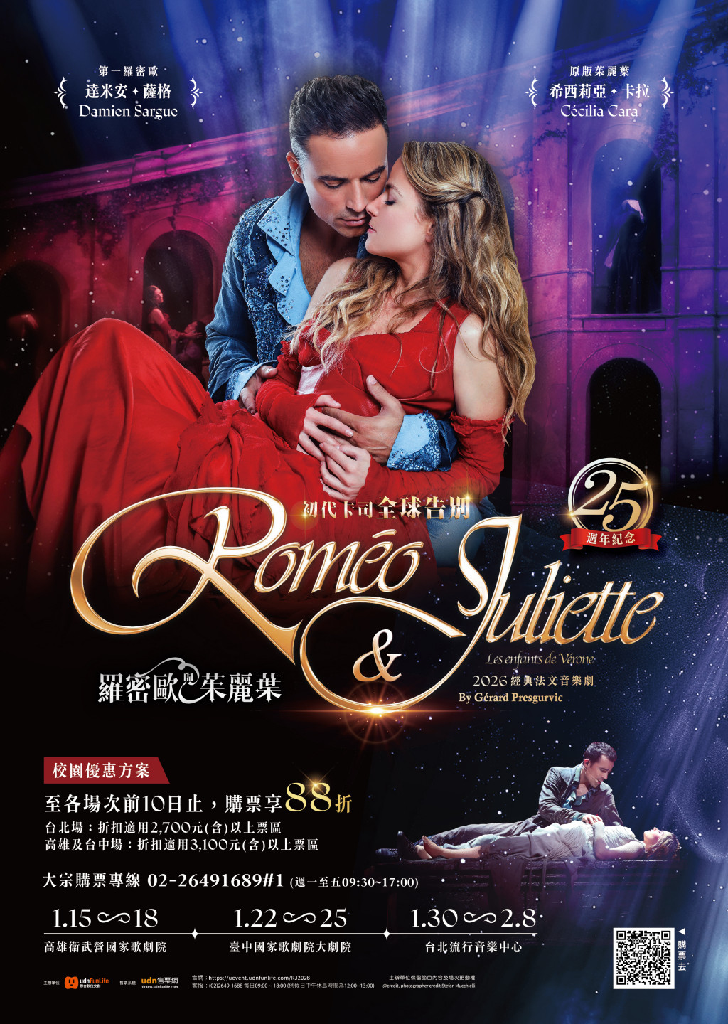 經典法文音樂劇《羅密歐與茱麗葉》自2001年在巴黎首演即轟動全球,以磅礴動人的音樂、現代感十足的編舞與都市巴洛克風格美學,重新詮釋莎士比亞經典悲劇,劇中更以紅與藍兩大色系象徵家族對峙,展現強烈視覺張力;而初代卡司的演出早已成為大眾心中難以取代的記憶,本次適逢音樂劇25周年同時也是初代卡司告別巡演,讓這次在台灣的演出更具紀念性。表演場次: