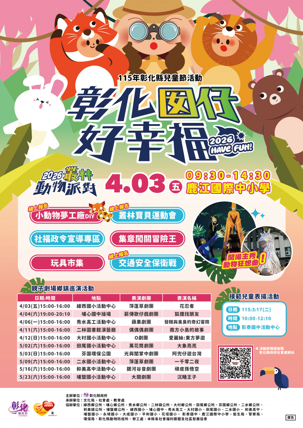 說明:一、旨揭活動以「兒童權利公約」及「兒少安全」為主軸,邀請縣內家庭齊聚參與,鼓勵家長帶領兒童積極參與各項休閒育樂活動,並增進親子互動情感,透過本活動各項業務宣導,提升參與者對兒童權利公約及縣政福利資源之認識。 二、活動時間及地點如下:(一)日期:115年4月3日(星期五)上午9時30分至下午2時30分。 (二)地點:彰化縣立鹿江國際中小學(彰化縣鹿港鎮自由路300號) 三、 活動內容:主場秀「動物狂想曲」結合精彩特技與活力舞蹈表演、寶寶爬行、寶寶搬搬樂、叢林主題玩樂氣墊、親子手作、氣球魔術秀、玩具市集、寶貝嘟嘟車、叢林闖關冒險王、兒少團體表演等精彩活動及摸彩抽大獎,敬邀民眾同樂。 四、活動訊息請至本府社會處網站/活動訊息專區/彰化囡仔好幸福~115年彰化縣兒童節活動「2026叢林動物派對」(網址:https://reurl.cc/ZZRY8a)參閱。